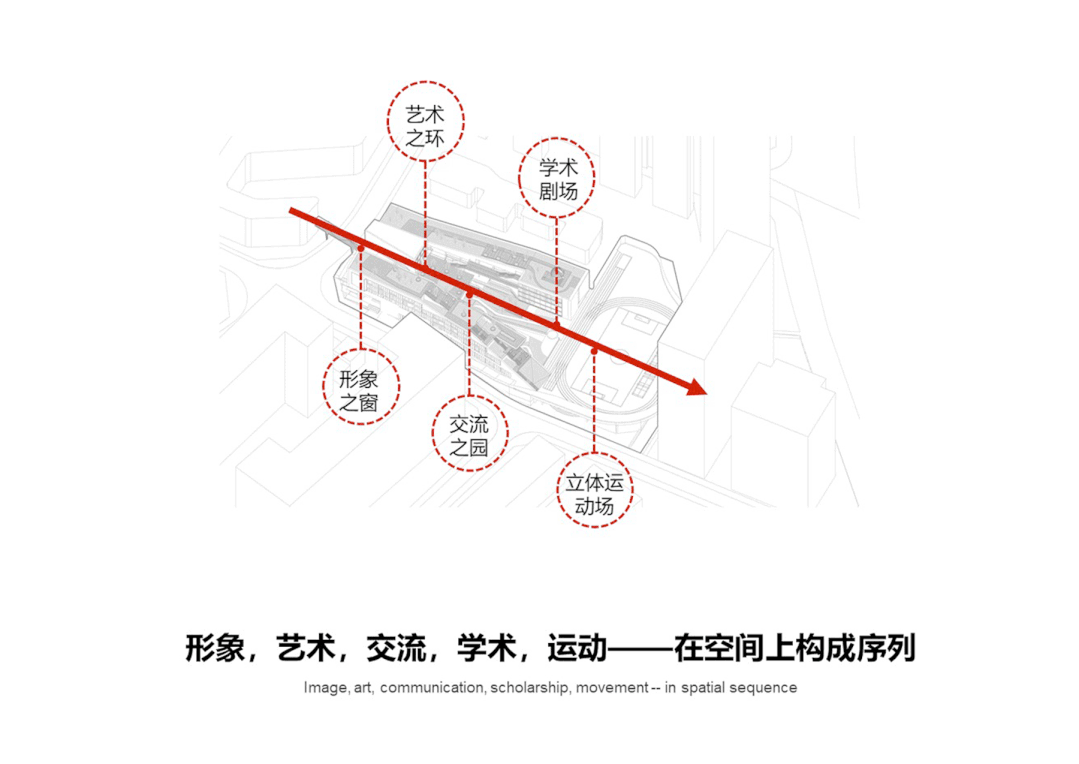 设计师希望在教学空间上构成传递“形象、艺术、交流、学术、运动”的序列,通过营造“NATURE 自然/科学”、“ART 艺术/文化”、“SPORTS 体育/健康”、“COMMUNITY 社区/交流”的使用场景,丰富校园的使用体验。