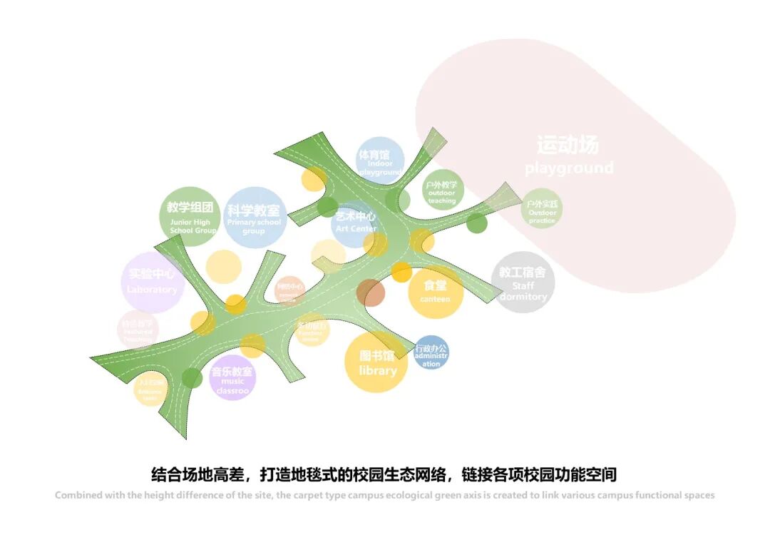 设计方打破常规校园的建筑形式,打造了一座融合自然生态、科学合理、教育理念先进的多元化“绿谷校园”。