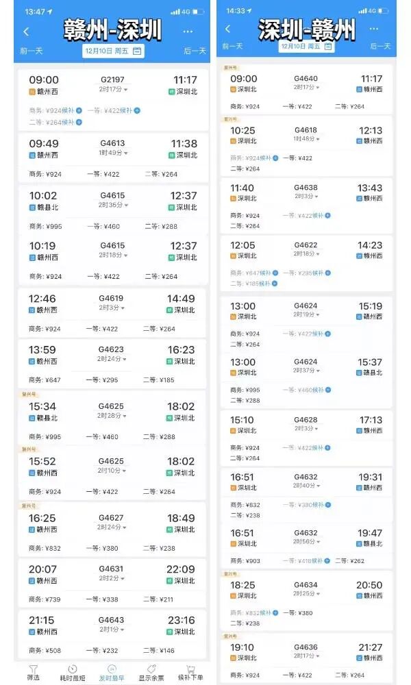 最早一趟车为12月10日9:00出发的G4640次列车,二等座票价为264元,一等座票价为422元,商务座票价为924元。