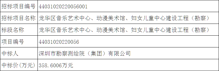 龙华区音乐艺术中心、动漫美术馆、妇女儿童中心建设工程(勘察)标段已于2022年7月19日完成定标,现将中标情况公示如下: