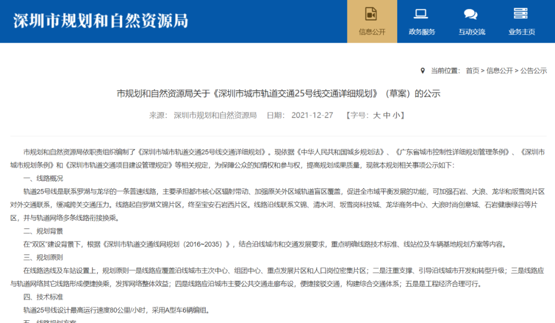 12月27日,依据相关规定,为保障公众的知情权和参与权,提高规划成果质量,深圳市规划和自然资源局公示了《深圳市城市轨道交通21号线交通详细规划》(草案)、《深圳市城市轨道交通25号线交通详细规划》(草案)。