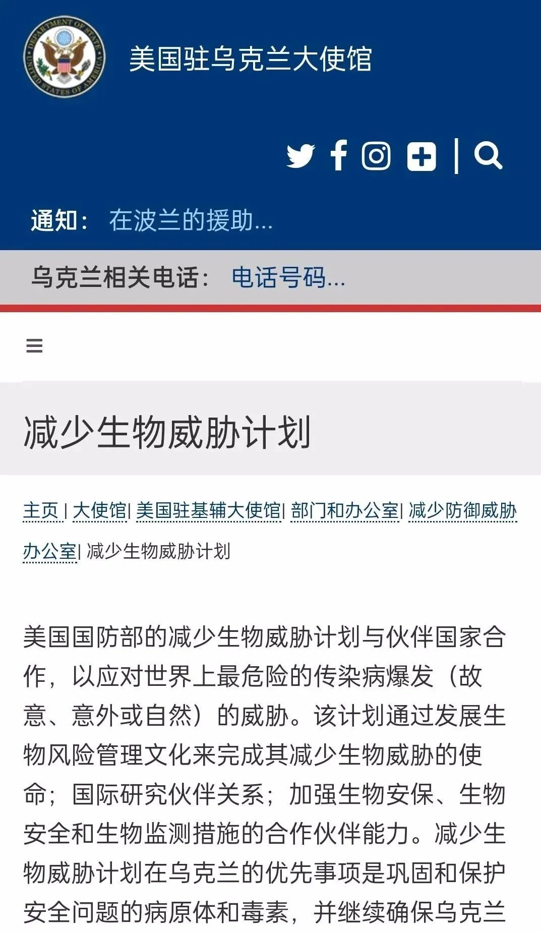 乌克兰有没有为美国撇清关系暂且不说,但至少有一点是肯定的:两者确实有生物实验合作项目,而且是与美国防部合作。美国驻乌克兰大使馆网站则解释说,美国国防部的“减少生物威胁计划”与乌克兰合作,是为了应对世界上最危险的传染病爆发(故意、意外或自然)的威胁,确保乌克兰能够提前发现疫情。
