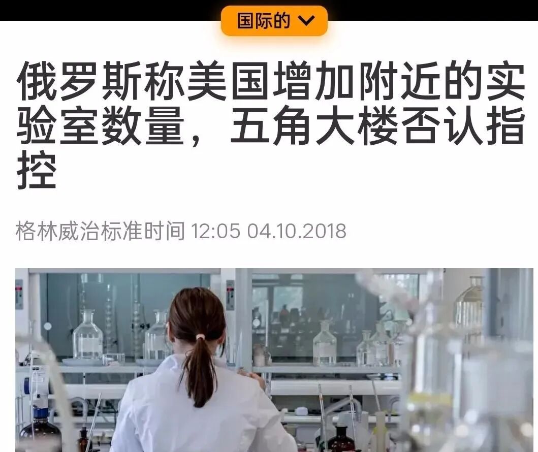 2018年4月,俄罗斯国防部官员称,美国的生物实验室一直是对俄罗斯和中国构成生物威胁的来源。这名官员表示,俄罗斯国防部知道美国正在研究违反国际协议交付和释放生物武器的方法。
