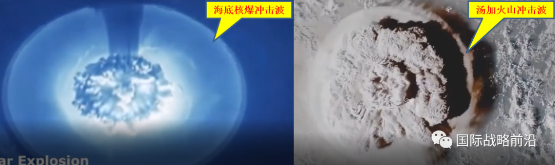 首先我们通过卫星视频看到,火山爆发的一瞬间,产生了巨大的冲击波,虽然火山爆发的总能量可能高达100颗原子弹,但那是在持续爆发过程中所释放的能量;而在火山爆发一瞬间,却产生了如此巨大的冲击波,绝非自然产生的现象,因为火山爆发的响应时间通常比较长,比如引发喷发的地震能量很大,但一般都是以分钟来计算,瞬间能量被时间稀释;而在几秒内产生如此大的冲击波,显然是核爆才能够达到的;我们可以通过人工核爆的视频,与本次汤加火山喷发进行对比,就可以看到两者拥有极其类似的冲击波;事实上,邪恶势力通过冲击波已经让方方面面看到了一次真实的核爆,而且海啸是由核爆而非火山激发;但对全球公众而言,则通过核爆所触发的火山喷发,又达到掩人耳目、混淆视听的目的;