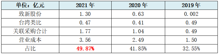 同时发行人向台湾类比和致新股份等关联方的采购金额和占比都在持续上升,2021年占比营业成本已接近50%。具体请见下表: