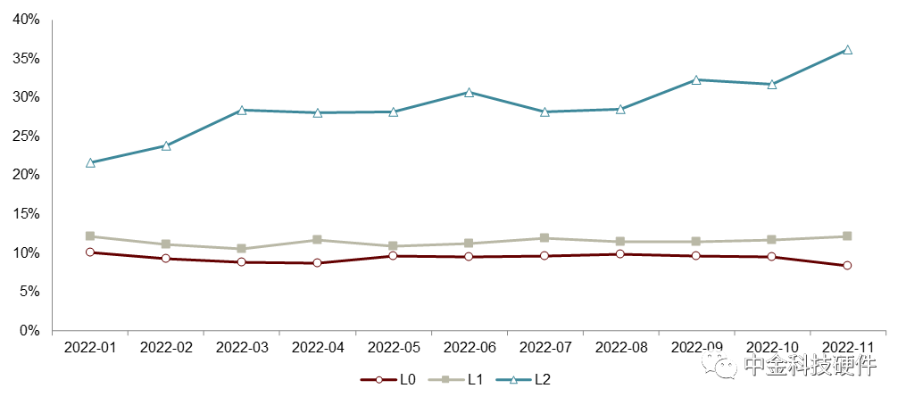 根据高工智能汽车数据,2022年1-11月国内乘用车市场L2级别ADAS(标配)累计渗透率达28.8%;其中,11月当月渗透率为36.1%,环比提升4.5 ppt,渗透率进一步提高。