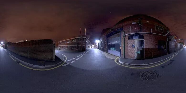 下图看起来像是一个360度的环境被展开成了平面,这种表现形式被称为等边投影。在三维虚拟环境中,这些投影会包裹在一个球体周围,来模拟真实世界。