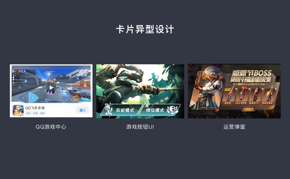 除了正常的卡片样式,还可以做一些异型的卡片设计。异型卡片具有较强的形式感和视觉冲击力,所以会比较多的用在游戏或者运营相关的界面中,吸引用户的注意力。缺点是批量化设计成本略高且因为过于风格化而不够耐看。
