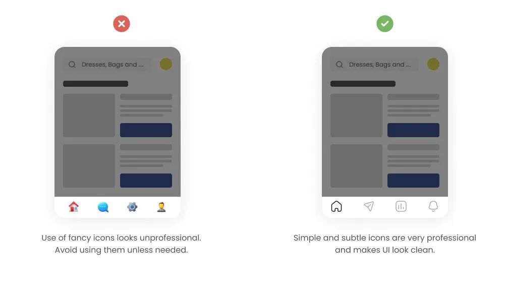 避免使用花俏和俗气的图标,它们会让整个设计显得非常不成熟,同时也是很难理解的。用上更简单的图标形式,会让界面更高级。(彩云注:当然越简单的图标其实想画出彩会更难,另外也需要区分不同的场景,像一些运营类的图标可能会为了活动氛围做的相对风格化一些。)