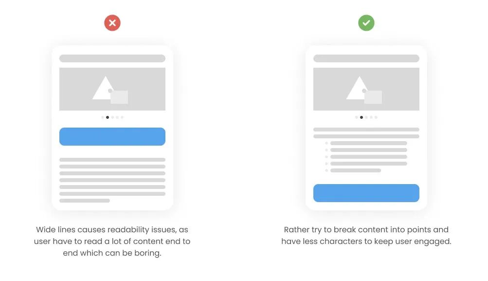 为了让用户聚焦阅读,应尽量避免使用大段的长/宽行。保持短句和简洁能够增加内容的可读性。(彩云注:这点用在你的作品集里也是很合适的,有些人经常使用大段的文字内容来描述,很可能直接劝退面试官)
