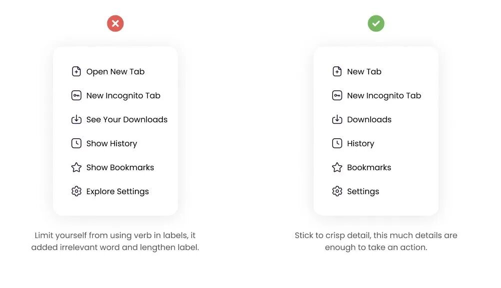 没必要在菜单上增加动词和短语,用最少的信息写清楚功能就足够让用户理解了。所以,在菜单设计上要尽量避免增加无关紧要的词,这样才不会影响用户体验。