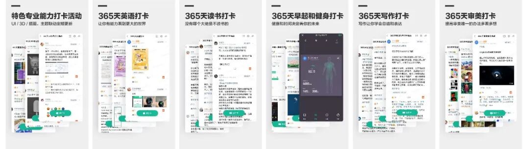 2)另外,还包括审美打卡、写作打卡、早起和健身打卡、读书打卡、英语打卡