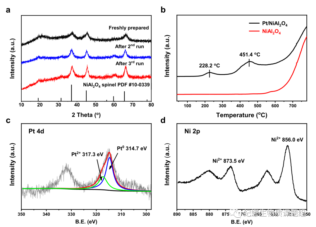 采用共沉淀法合成了NiAl2O4尖晶石。室温下,六水合硝酸镍(Ni)和硝酸铝(Al)溶解在超纯水中。滴加氨水,直到pH值达到8。搅拌,沉淀物过夜老化。过滤,去离子水洗涤。干燥,800℃下焙烧8h。等体积浸渍法制备了Pt/NiAl2O4。80℃下干燥过夜,焙烧4h。氢气还原最终得到Pt/NiAl2O4催化剂。XRD结果表明,Pt/NiAl2O4具有良好的稳定性,即使经过3次反应,由于NiAl2O4载体的结晶度略有提高,衍射峰也略有增加。H2-TPR谱图中228.2 ℃处的还原峰可归因于PtOx的还原,而451.4℃的峰与PtOx和NiOx物种的共同还原有关。XPS谱中的Pt4d5/2谱可分为两部分,314.7 eV对应于Pt0物种,317.3 eV对应于Pt2+物种。而Ni的化学态主要由Ni2+物种组成,分别为873.5 eV和856.0 eV。