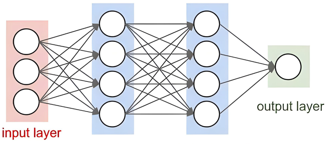 每个隐藏层中的神经元都从前一层的所有神经元接收输入,这一过程在隐藏层的每个神经元上都重复进行,直到达到输出层。