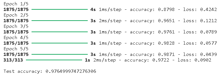import tensorflow as tffrom tensorflow.keras.layers import Dense, Flattenfrom tensorflow.keras.models import Sequentialfrom tensorflow.keras.datasets import mnist# 加载数据集(train_images, train_labels), (test_images, test_labels) = mnist.load_data()# 数据预处理train_images = train_images / 255.0test_images = test_images / 255.0# 构建模型model = Sequential([Flatten(input_shape=(28, 28)), # 将图片从2D数组转换为1D数组Dense(128, activation='relu'), # 添加一个具有128个节点的密集连接层Dense(10, activation='softmax') # 添加一个10节点的softmax层,返回10个概率分数的数组])# 编译模型model.compile(optimizer='adam',loss='sparse_categorical_crossentropy',metrics=['accuracy'])# 训练模型model.fit(train_images, train_labels, epochs=5)# 评估准确率test_loss, test_acc = model.evaluate(test_images, test_labels)print('\nTest accuracy:', test_acc)