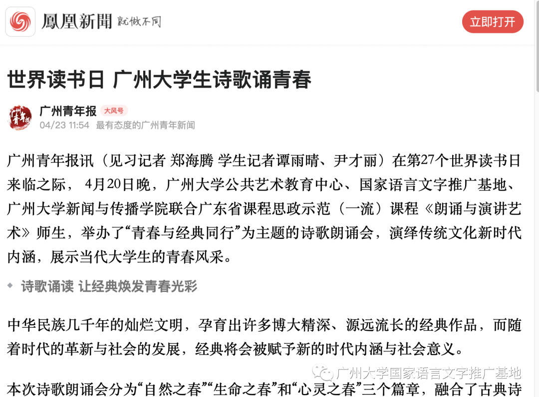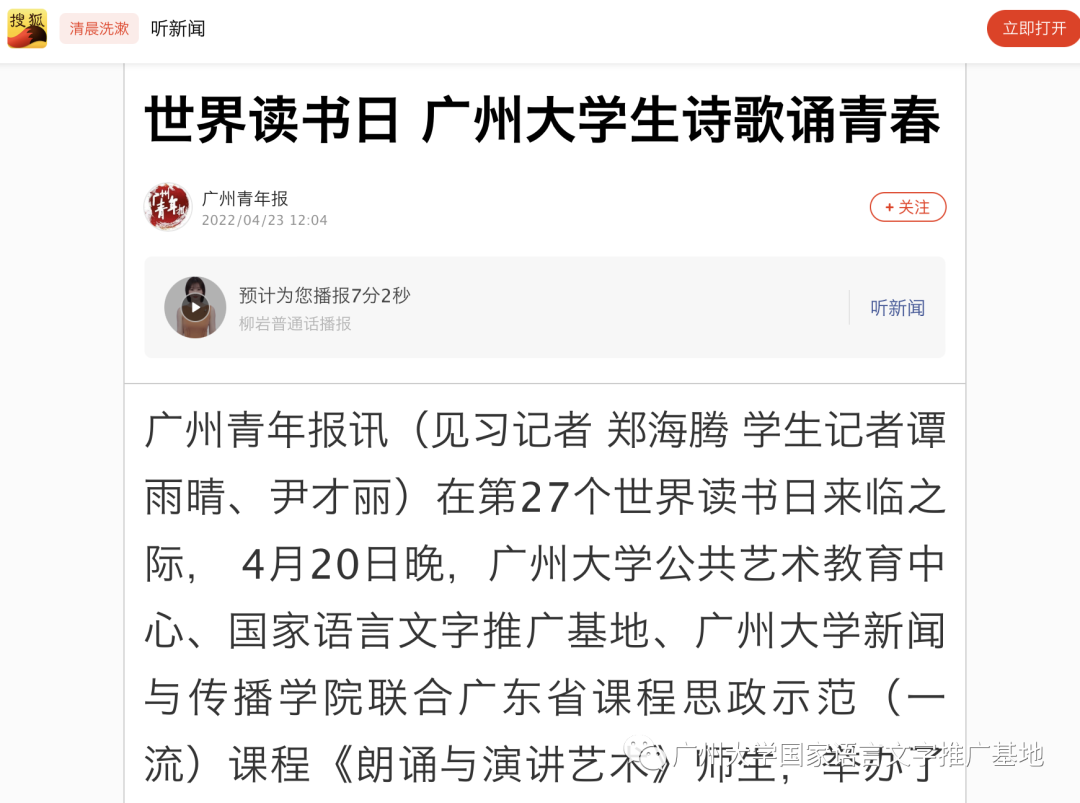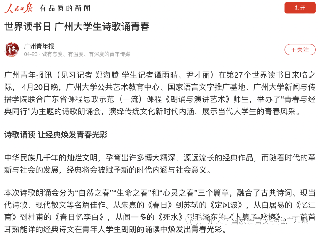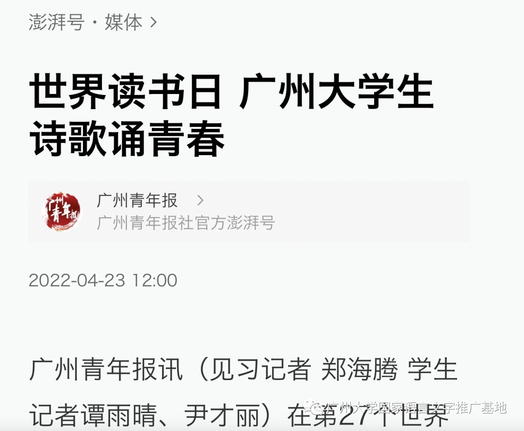 近日,广州大学师生相继荣登人民日报、中国青年报、广州青年报、澎湃新闻、凤凰新闻、搜狐新闻、网易新闻、今日头条、广州市融媒云门户等媒体平台。