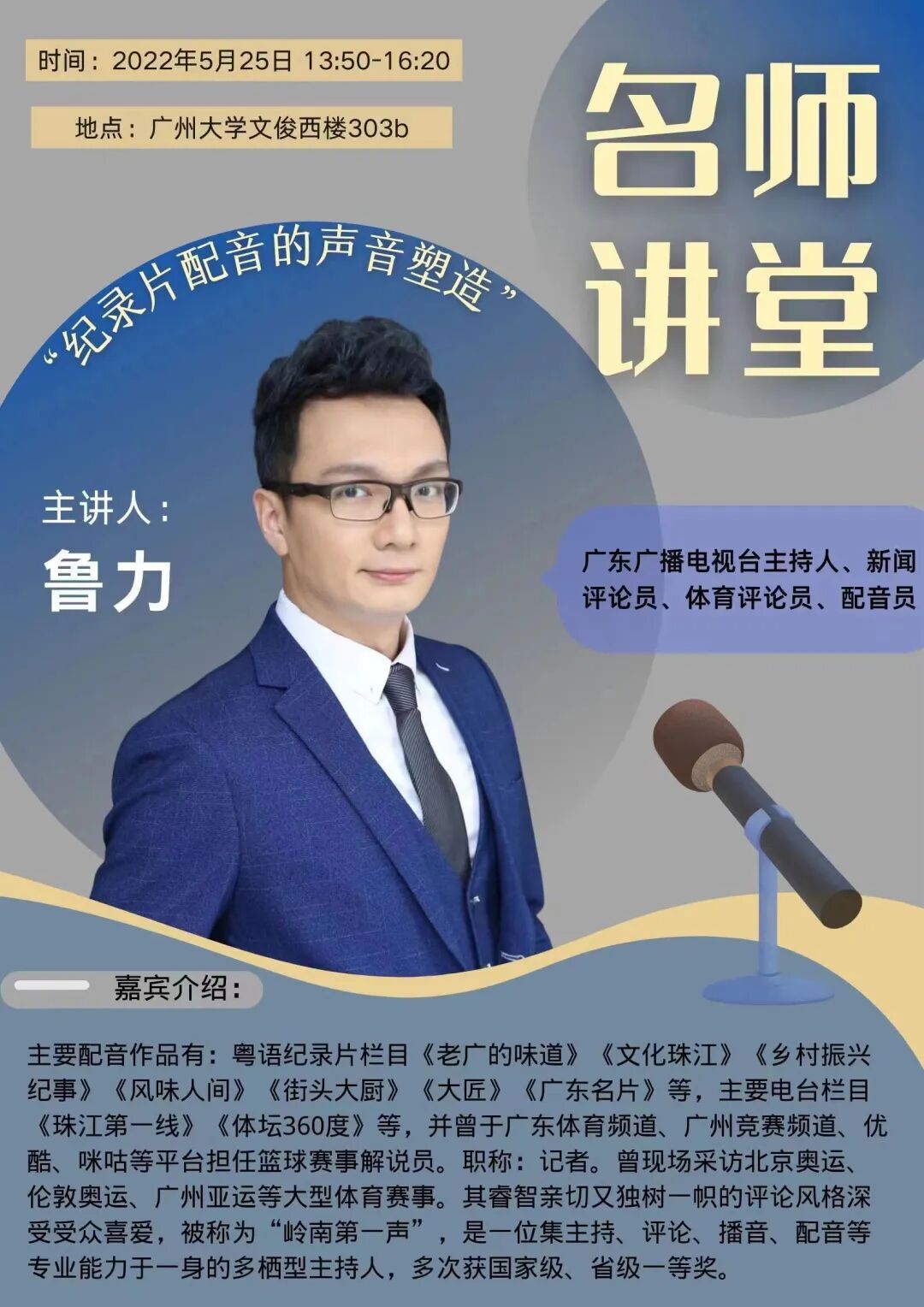 2022年5月25日下午两点,在广州大学文俊西楼课室里举行了一场生动有趣的名师讲堂——“纪录片配音的声音塑造”,由广东广播电视台主持人、新闻评论员、体育评论员、配音员鲁力开讲。