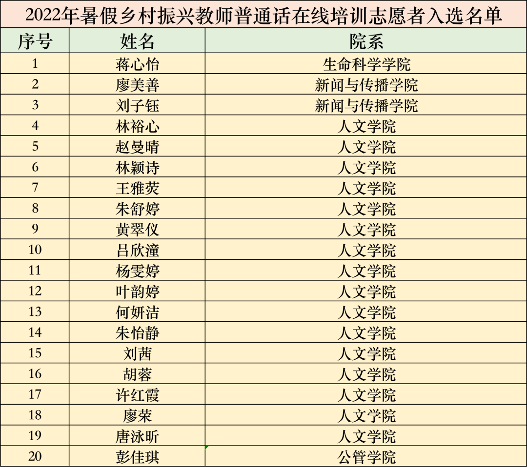 本次2022年暑期乡村振兴普通话在线培训志愿者招募,最终经评委决定,蒋心怡、林裕心等20名同学成功通过面试并入选!热烈祝贺入选者!