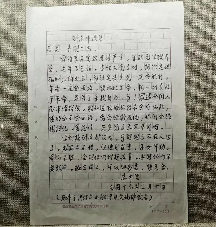 1928年3月10日,钟志申给两位哥哥写下一封遗书。几天后,钟志申被杀害于长沙浏阳门外识字岭,年仅35岁。