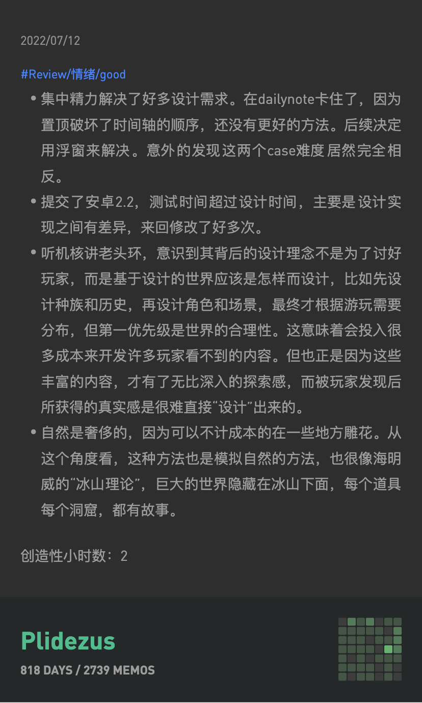 •当日的情绪如何(分为 low、mid、good)•当日的事情,从早到晚进行 log 一些概要,同时还有一些简单的感触•当日创造性的时间