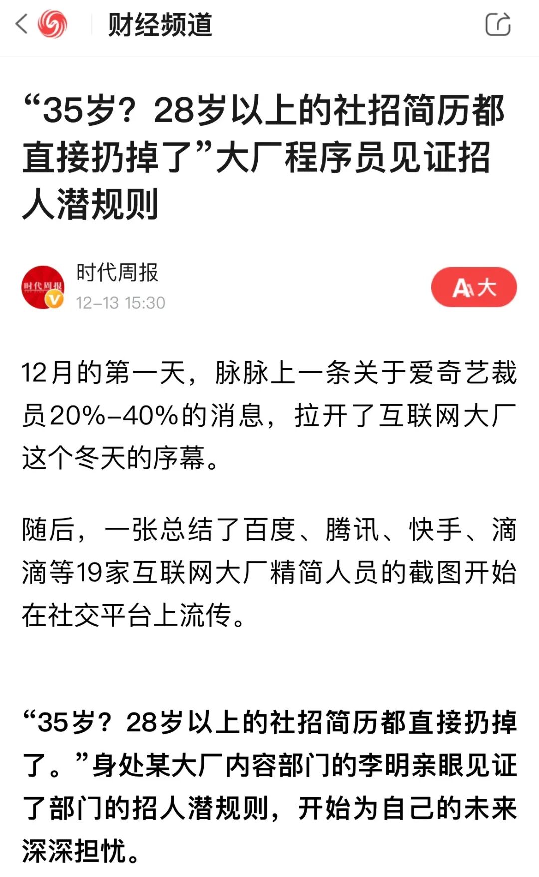 有做HR的朋友说,不是不想招年龄大的员工,而是老板指定要年轻的:“年轻人虽然什么都不会,但是好教,中年人学习能力不行了,而且熬不动了,你指望3、40岁的人996吗?上有老下有小,说不定还要生个二胎、三胎,我们企业养不起。”