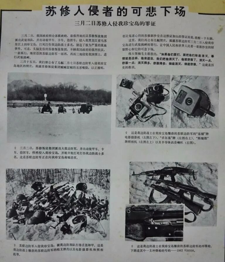 1969年3月2日,苏联边防军侵入珍宝岛,袭击中国边防部队巡逻人员,打死打伤6人。中国边防部队被迫自卫反击,将入侵的苏军逐出珍宝岛。15日,苏联边防军3次出动向守卫珍宝岛的中国边防分队发起猛烈进攻,并用多种火炮轰击中国境内纵深地区。