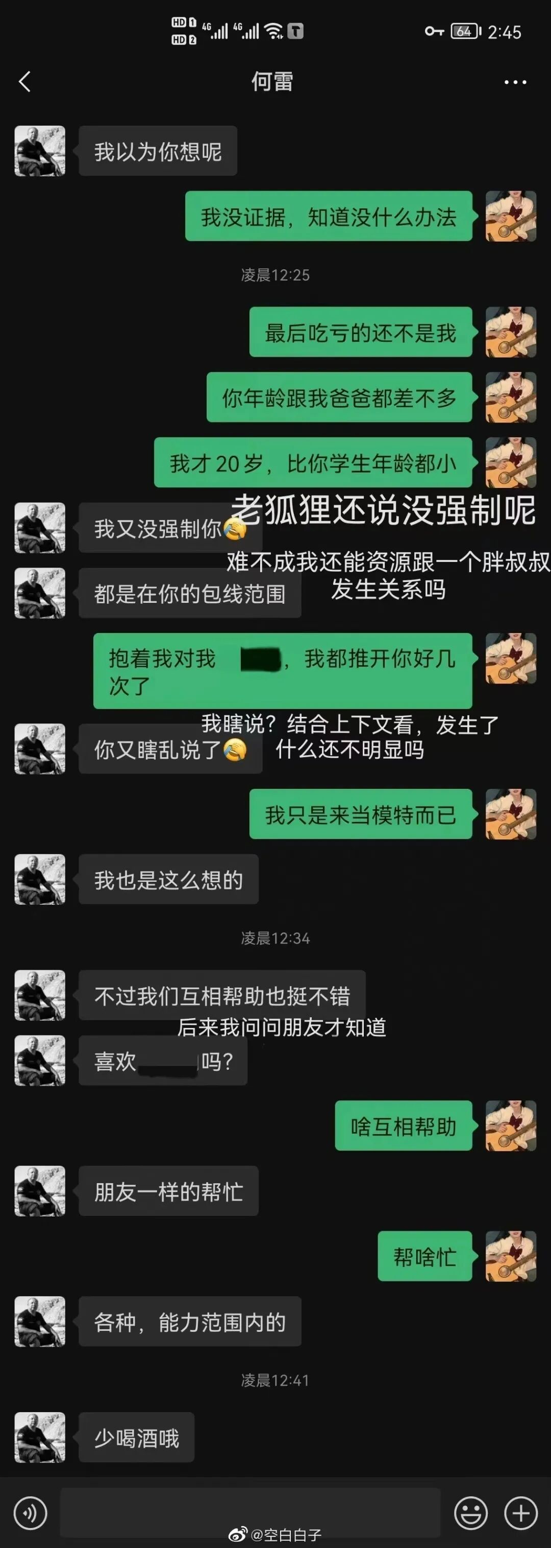 据其提供的聊天记录显示,白女士指控何某猥亵,何某则回答称“我以为你想”,还表示自己并没有强制她。聊天记录最后,何某还表示“互帮互助也挺不错”“在能力范围内的、朋友一样的帮忙”。![]()