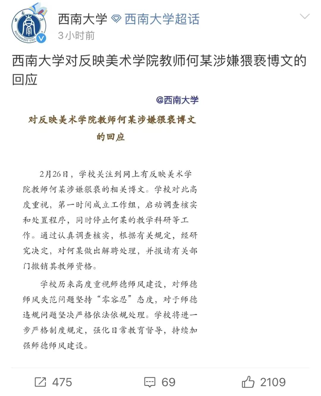 今天,西南大学官方微博@西南大学 发布对反映美术学院教师何某涉嫌猥亵博文的回应:通过认真调查核实,经研究决定,对何某做出解聘处理,并报请有关部门撤销其教师资格。西南大学美术学院官网资料显示,何某是西南大学美术学院雕塑系讲师,2005年毕业于俄罗斯列宾美术学院雕塑专业,获硕士学位,是中国雕塑家学会会员,重庆雕塑家学会理事。2月27日晚,西南大学党委宣传部方面表示,公安已拘留涉事教师,学校正在配合警方提供相关的材料。等警方对此事定性后,校方再根据警方的调查结果对该教师进行处理。
