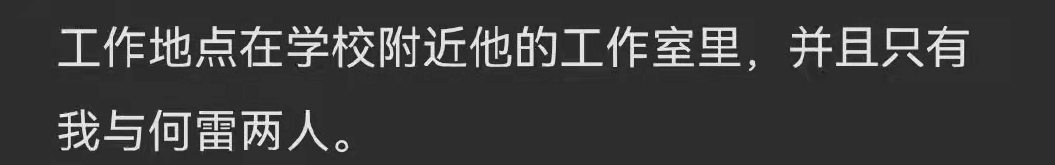 白女士称,从2月17日到26日,一共拍摄三次。前两次拍摄顺利,直到26日最后一次拍摄时,何某在拍摄间段休息中开始对她动手动脚,并实施了猥亵行为。这是来自该位女模特的控诉,污辱她的人是西南大学雕塑系的老师何雷。见女模特没有作声,何雷直接让女模特坐在他腿上,然后上下其手。女生好不容易才脱身,终于从何雷的魔掌下脱离了出来。这位女生后来在微博上说,自己从来没想到会发生这样的事情。