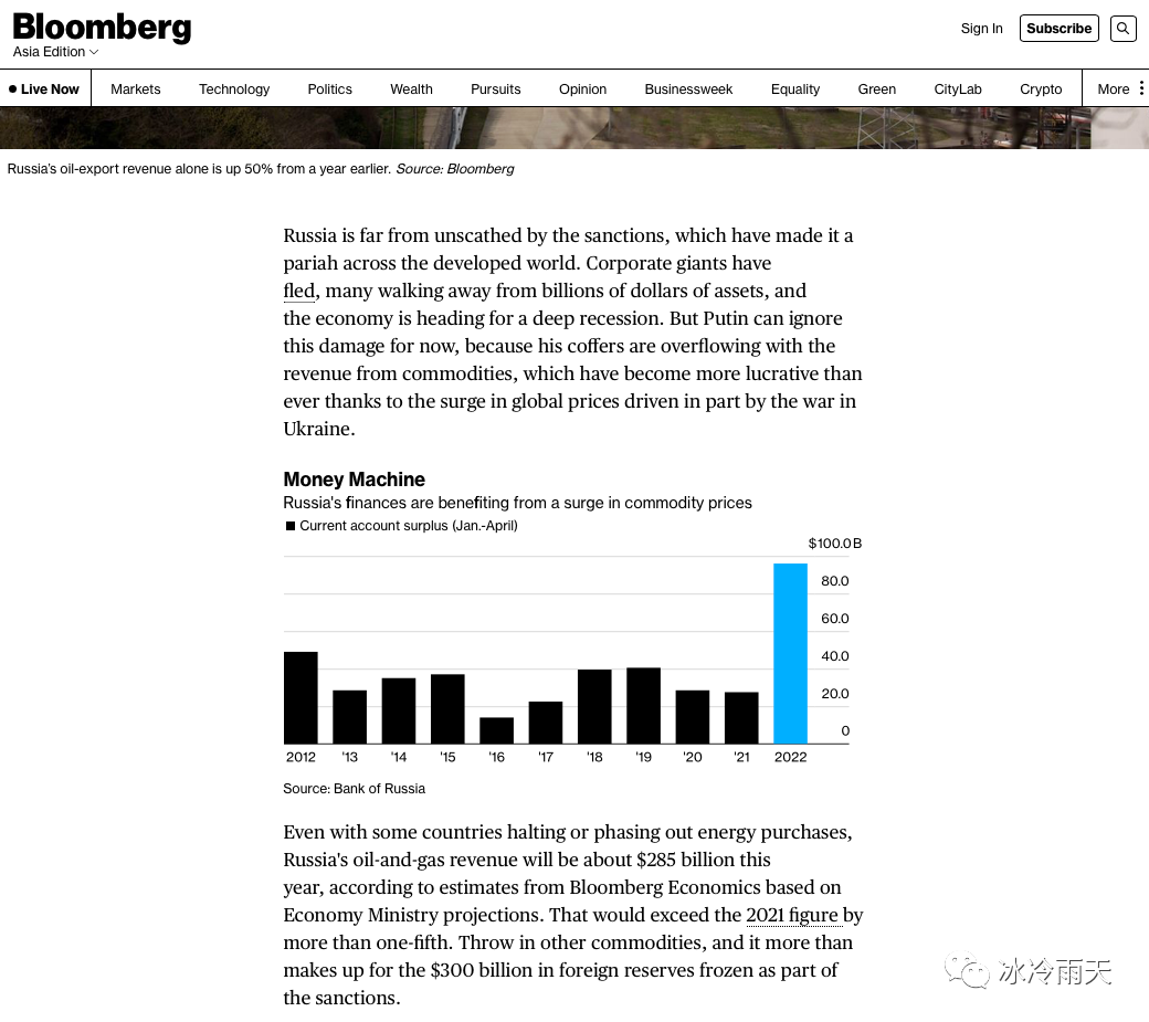 其实不是这样的。彭博社6月1日引援俄罗斯联邦经济发展部的预测说因为石油天然气价格的走高,俄罗斯今年在油气收入上能达到2850亿美元,比去年增收20%。加上其他商品的国际收入,能补上被西方制裁冻结的3000亿美元。