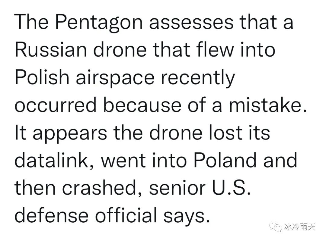 五角大楼认为最近飞入波兰领空的俄罗斯无人机是由于一个错误而发生的。美国国防部高官说,这架无人机似乎失去了数据链而进入波兰然后坠毁。![]()