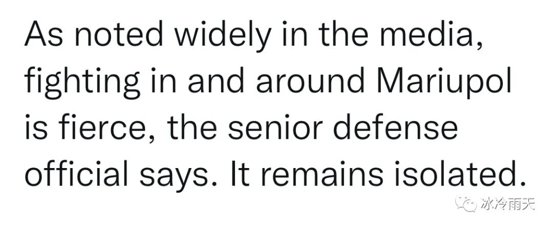 这位国防部高官说,正如媒体广泛报道的那样,马里乌波尔及其周边地区的战斗非常激烈。这个城市仍然被包围。![]()