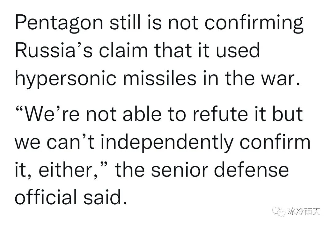 五角大楼仍未证实俄罗斯有关它在战争中使用了高超音速导弹的说法。 “我们无法否认,但我们也无法独立证实,”这位国防部高官说。![]()