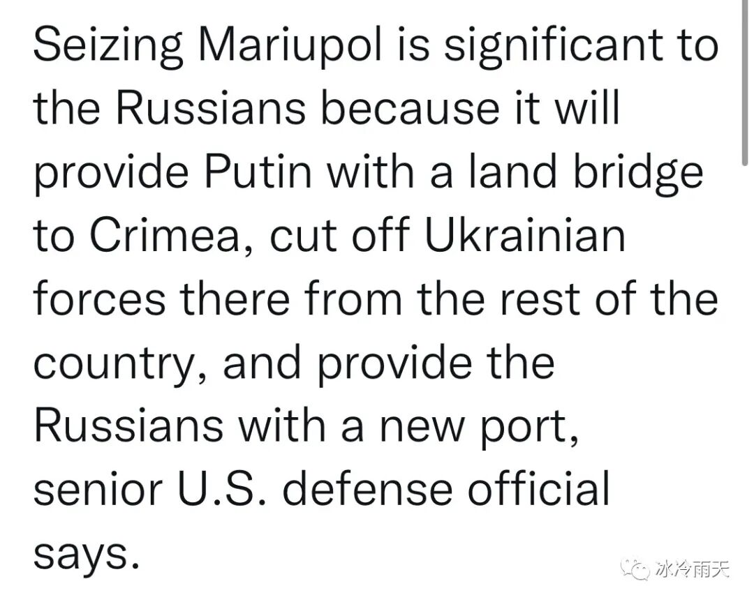 美国国防部高官说,占领马里乌波尔对俄罗斯人来说有重大意义。因为它可以为普京提供通往克里米亚的陆桥,切断在那里的乌克兰军队与该国其他地区的联系,并为俄罗斯人提供一个新港口。