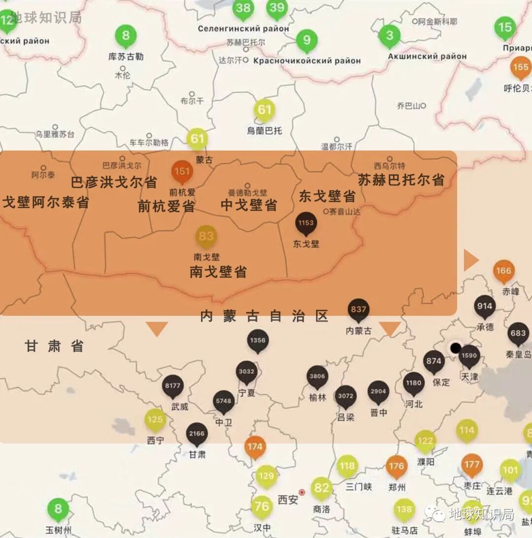 于国内是黄河几字湾周边,即宁夏和内蒙古的巴彦淖尔与呼包鄂地区。这里不但会受到蒙古国沙源的影响,其周边就有巴丹吉林沙漠、腾格里沙漠、毛乌素沙地等中国八大沙漠中的四个。只不过受限于人口规模和经济政治地位,这里往往不受区域外的人关注。