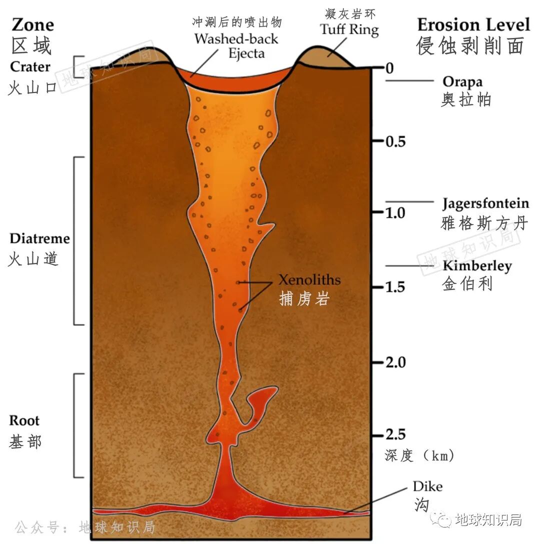而后,经过一系列地质活动,金伯利岩浆喷出将钻石带到近地表,这也是钻石成矿与否的关键一步。金伯利岩浆喷出后,喷出路径内的岩浆会冷却,形成金伯利岩体,钻石就被包裹在其中。