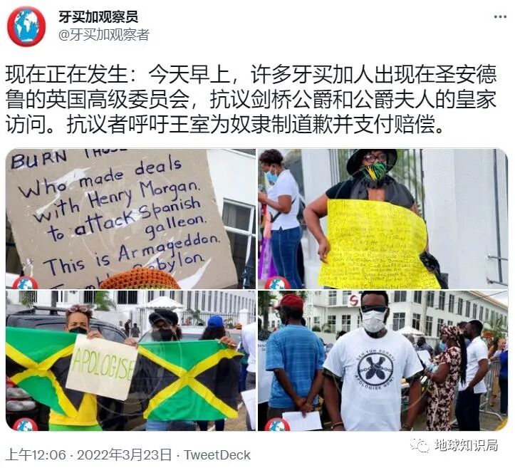 如今,代替英国君主巡视加勒比海地区的王子公主们,遇到的不再是谄媚的欢迎队伍,而是如影随形的抗议。要求英国为过去的殖民暴政道歉赔偿。
