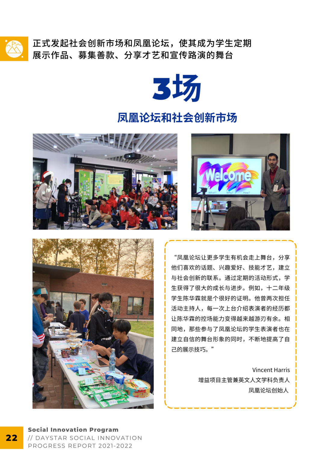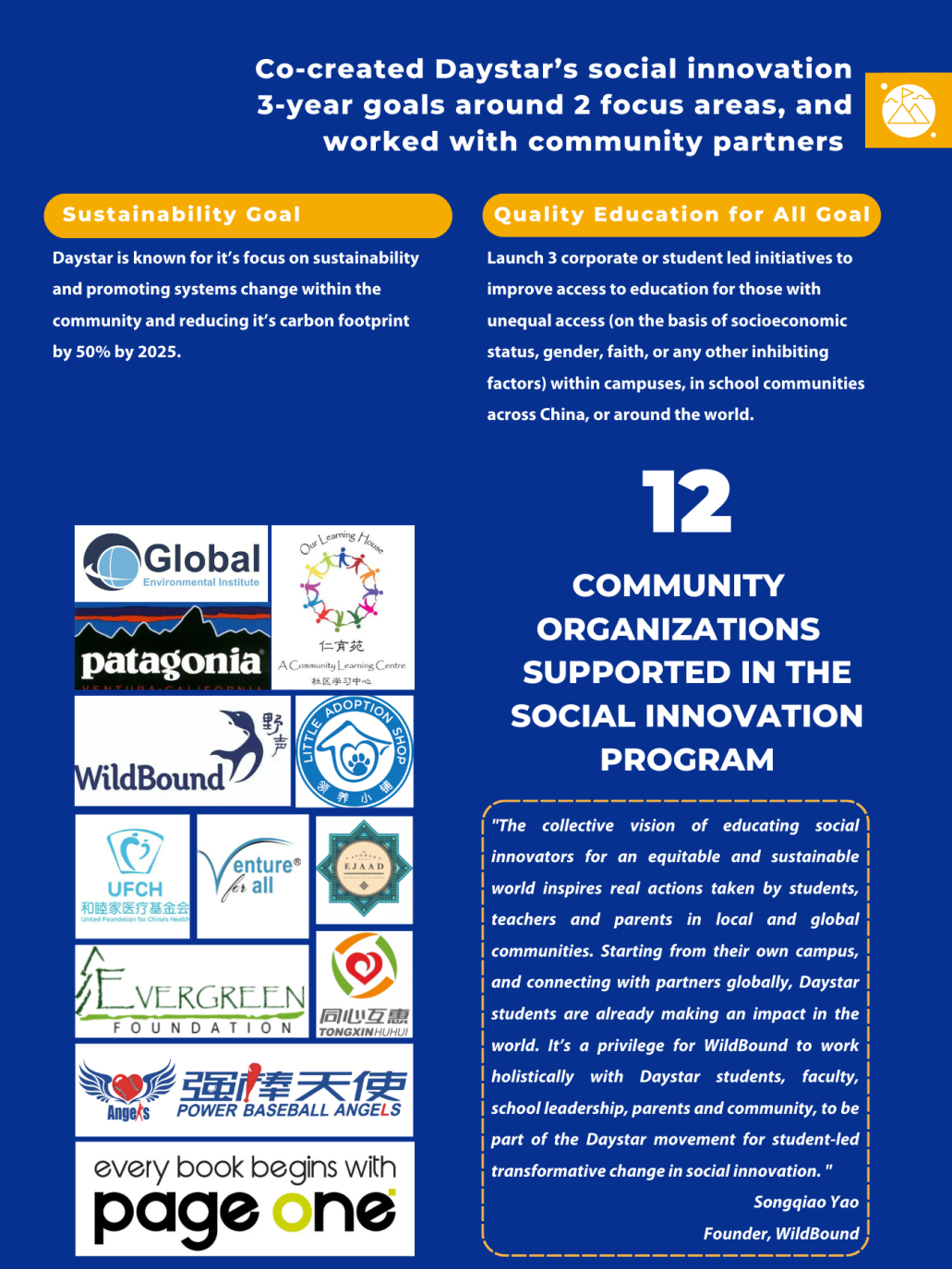 This, our inaugural Social Innovation Report, is a means of highlighting the exciting progress made from 2021-2022 and the path forward in achieving our 3-year strategic goals around Social Innovation. These include imbuing students, staff and parents with a social innovation mindset, developing a world class K-12 social innovation program at Daystar, supporting the development of youth social innovators in China through the Qi Social Innovation Center, and demonstrating that we are a sector leader through our commitment to positive social change.