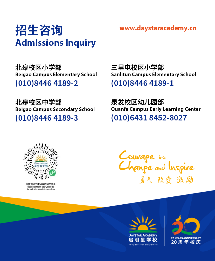 Founded in 2002, Daystar is dedicated to offering a balanced Chinese-English bilingual and bicultural education to cultivate world citizens with both Chinese and Western cultural backgrounds. At the time of its founding, Daystar was one of the few schools in Beijing with such a forward-looking and international educational vision.