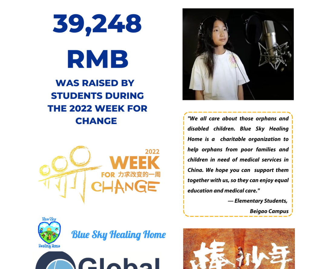 After being postponed for two years due to COVID-19, on May 16, 2022, “Week for Change” returned as an online event for elementary and middle school students at the Daystar Sanlitun and Beigao campuses. During this week, students connected directly with the 3 charity organizations that they supported: Power Baseball Angels, Blue Sky Healing Home, and the Global Environmental Institute (GEI). They learned about their programs and also raised 39,248RMB through various activities. The event culminated in an online celebration: student and teacher representatives shared their feelings and reflections with the Daystar community and called on everyone to maintain this Daystar tradition and make a positive difference in the world around us.