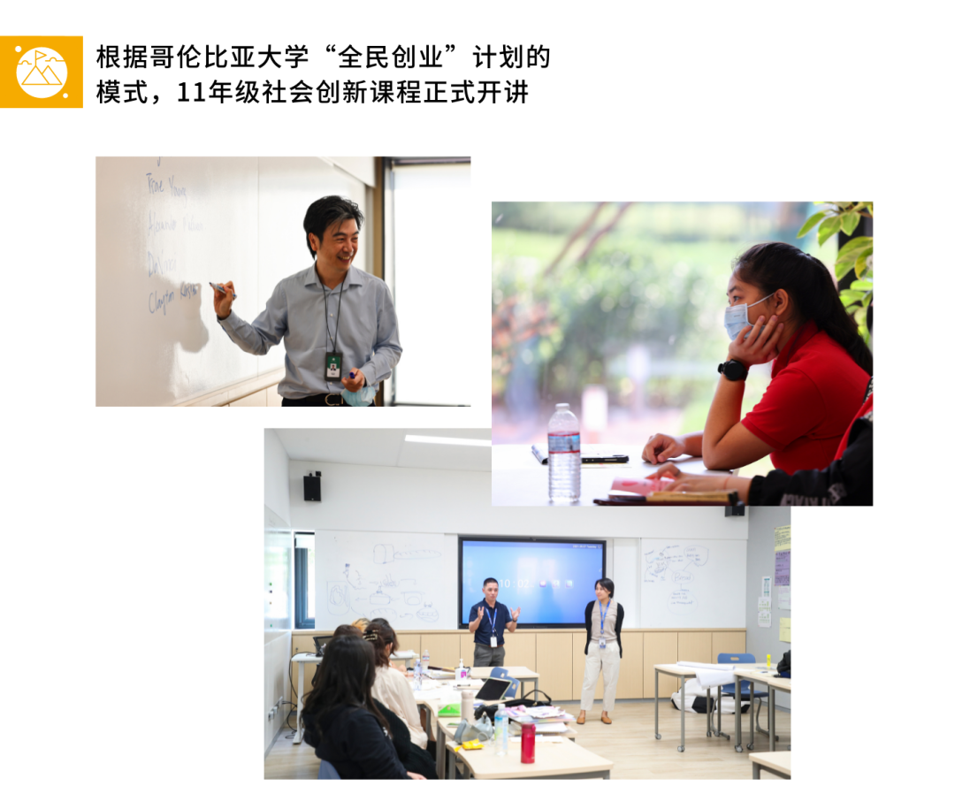 以哥伦比亚大学“全民创业”计划(Venture for All)的模式,社会创新课程在10年级正式开讲。课程在引导学生发掘自身优势的基础上,通过设计思维和行动解决重要问题,融合了当代设计、创业、创新和团队领导力等领域的理论和实践。学生在课程里所学知识和技能也被直接应用和练习在他们的社会创新项目中。