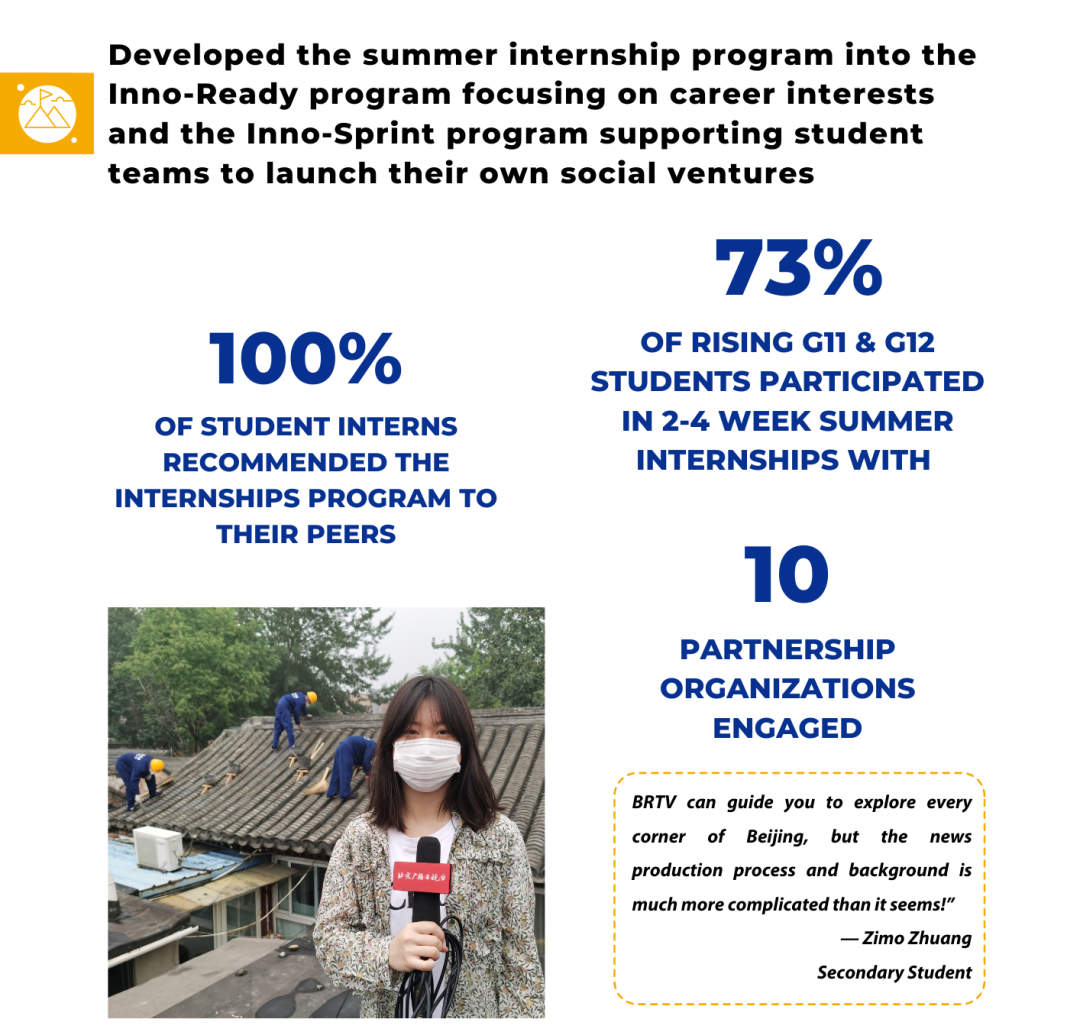 启明星的实习项目发展为创新准备和创新冲刺两种。前者侧重于为学生探索未来职业和大学申请方向提供在相关机构的实习机会,后者旨在通过提供孵化项目,帮助学生小组完成他们的社会创新类项目。两种实习项目都可以满足IB课程CAS部分的要求,因此启明星的两种实习项目都与学术学习有机结合在一起。