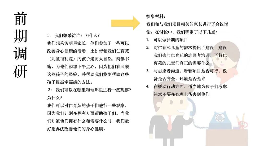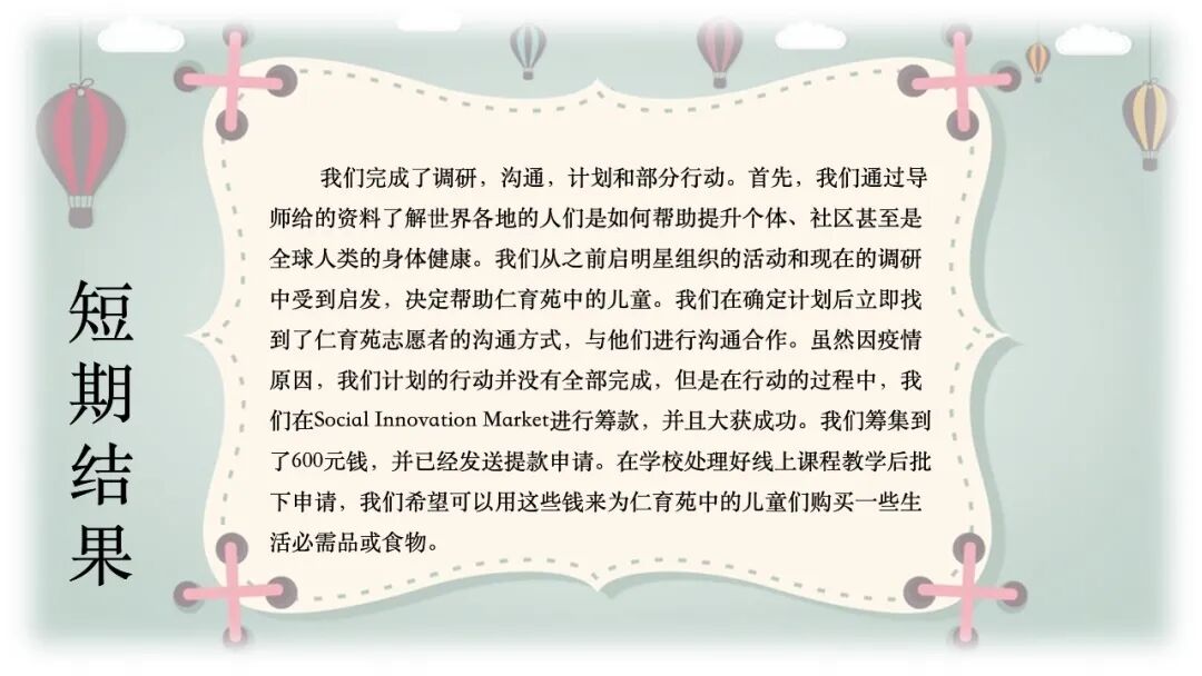 他们从启明星家庭一直帮助的仁育苑机构的孩子受到启发,关心这些孩子的心理健康和沟通能力发展;制定了阅读、游戏等陪伴计划和相应的宣传目标;并在计划执行过程中进行项目进展的评估和学习成果反思: