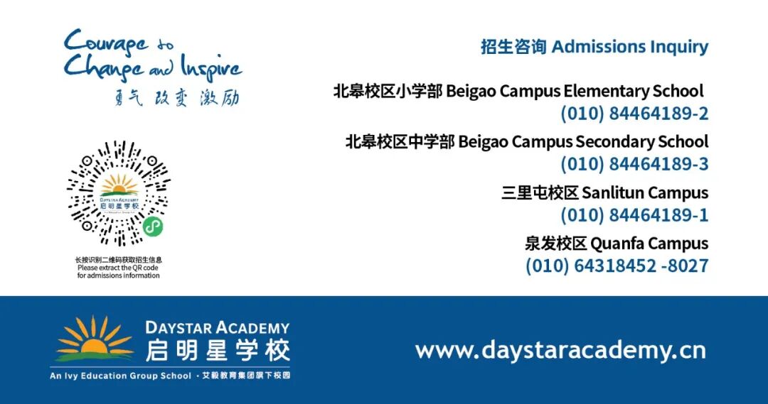 Daystar Academy is a mission driven school committed to helping every student develop the courage to change and inspire. We have a diverse student body of children aged 1.5-18 at three campuses in Beijing.
