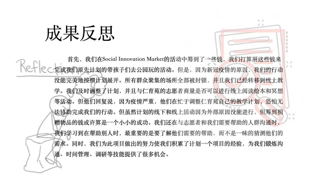 发现问题、背景调查、制定目标和计划、着手实施、反思……这样完成一个项目,使得学生从PYP阶段开始训练的能力不断提升,很好地为未来衔接MYP个人项目和社会创新课程进阶项目做好了准备。