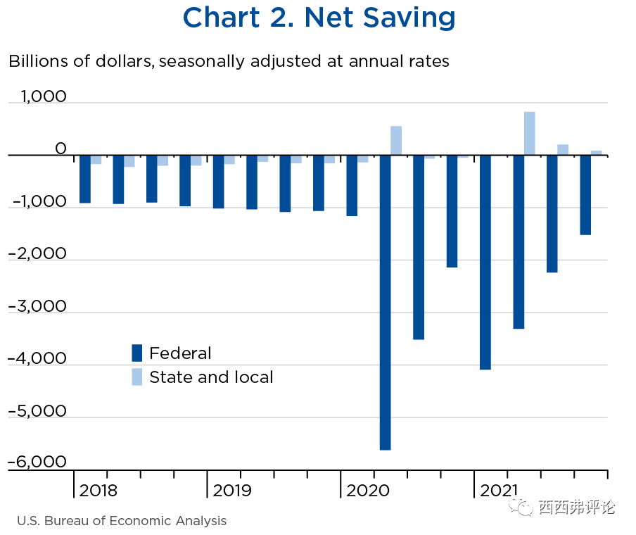 上面这张图是美国联邦政府 / 州和地方政府的净储蓄。可以看到,美国的联邦政府基本上就是只借不还的流氓,每年都是负的,而且年年增加。而州和地方政府的亏损却少得多,2020年和21年居然还出现了净储蓄。