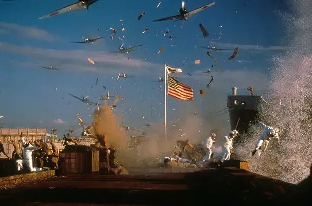 为打造出最壮观和惊险的空袭场景。特效协调人约翰·弗雷泽决定用700根棒状炸药、2000英尺导爆索和4000加仑汽油引爆6艘战舰。