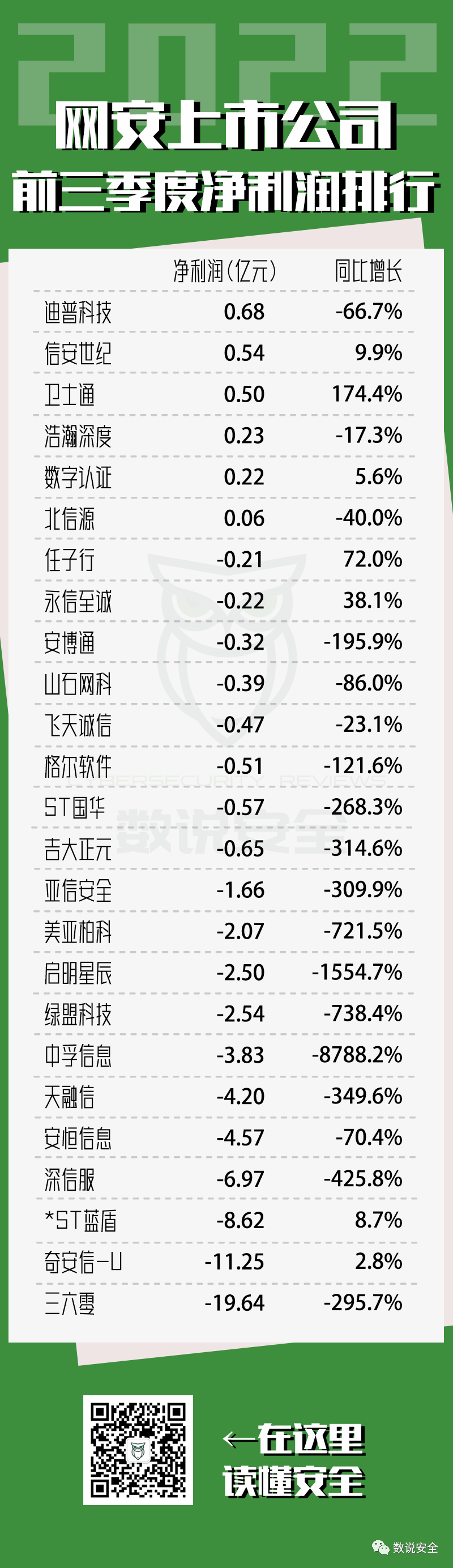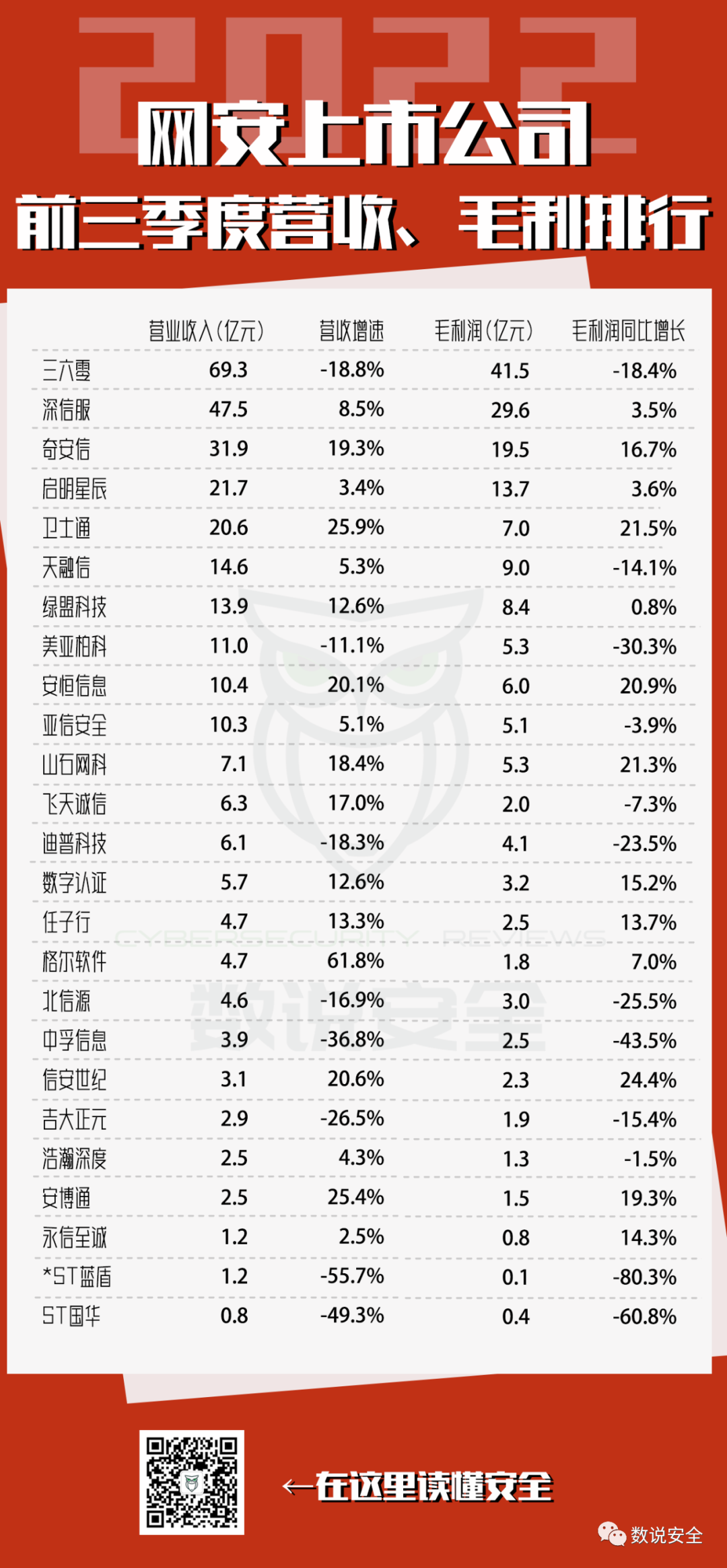 2022年网络安全上市公司Q3营收、净利润、毛利润排行