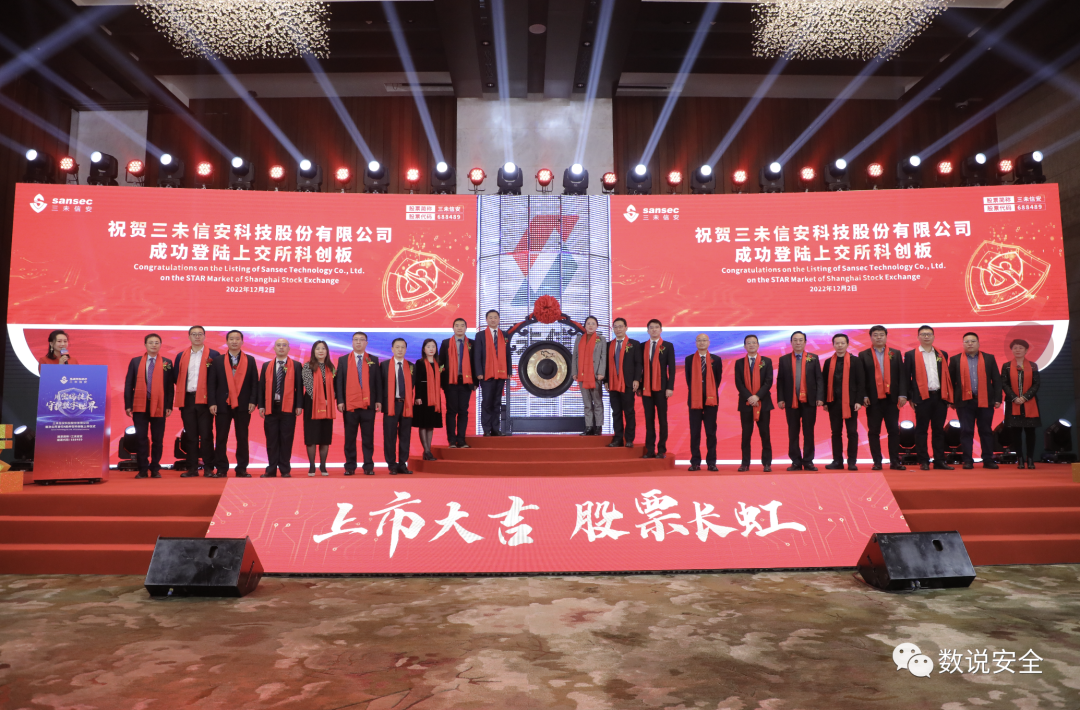 上市仪式上,北京市朝阳区人民政府发来贺词,对三未信安在上交所首发上市表示祝贺,高度肯定三未信安多年来深耕商用密码领域,传承推陈出新、攻坚克难的精神,并对三未信安未来发展提出期许。