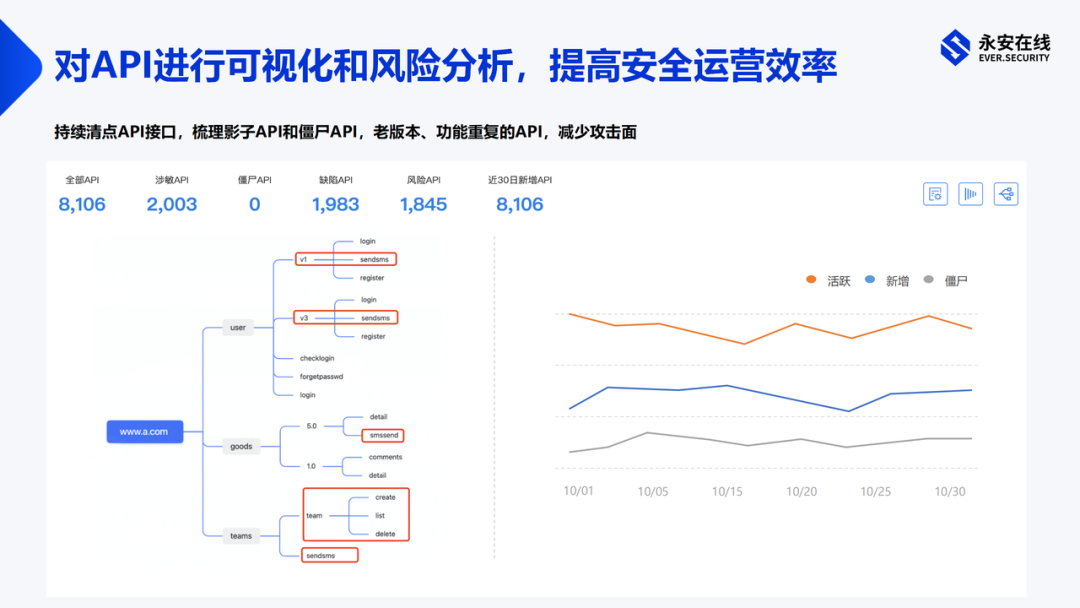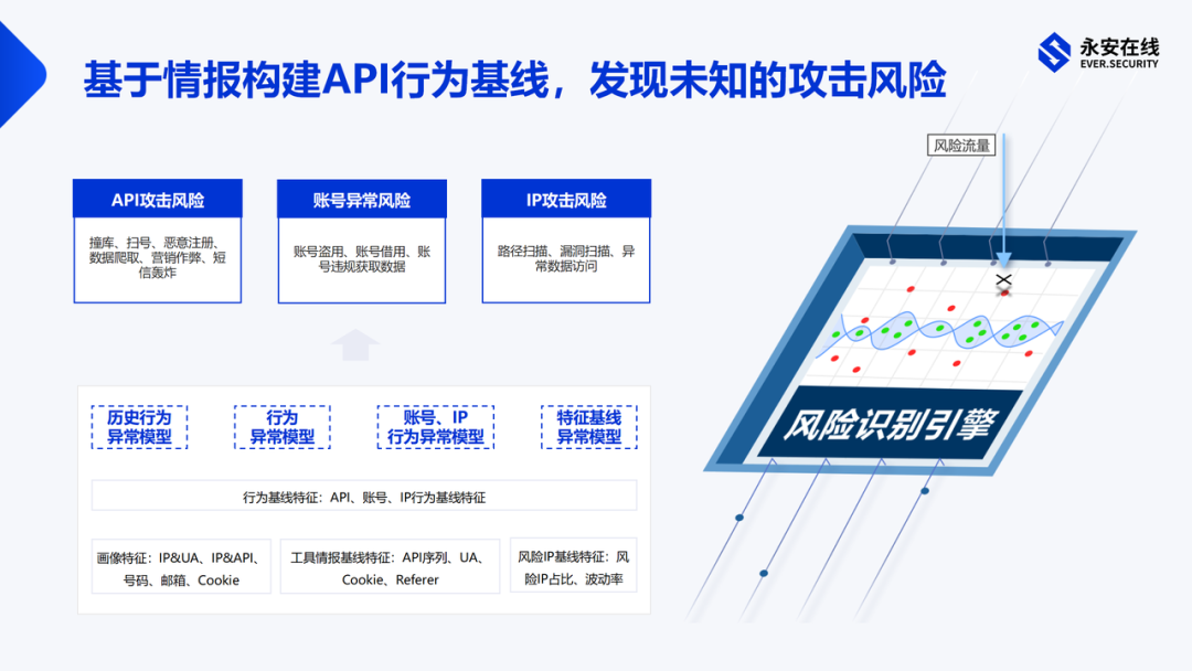 永安在线「API安全管控平台」基于情报(如攻击者利用的IP、自动化工具等资源)构建API安全行为基线,可不受业务波动影响,能更有效地感知外部API风险,误判率低,可用性更高。
